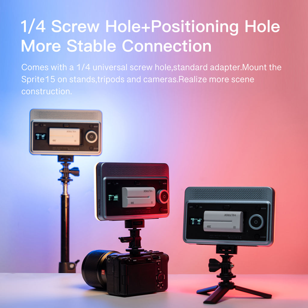 Він постачається з універсальним отвором для гвинта 1/4 та стандартним гніздом для перенесення. Sprite 15 можна під'єднати до стійки, штатива, тримача світла та камери. Реалізуйте побудову схеми заповнення світла для зйомки сцен.