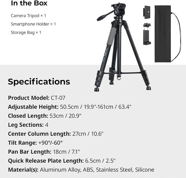 Попри міцну алюмінієву конструкцію, штатив дуже легкий і компактний — вага лише 1087 г, а у складеному стані він займає всього 53 см. Це робить його ідеальним для подорожей, влогів та виїзних зйомок — він без проблем поміститься у рюкзак або сумку.